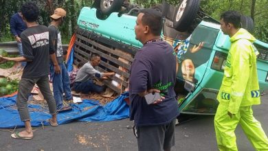Diduga tidak kuat menanjak, Mobil Pengangkut Buah Terjungkal Di Tanjakan Jalan Alternatif.